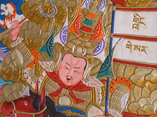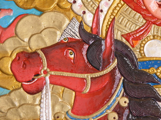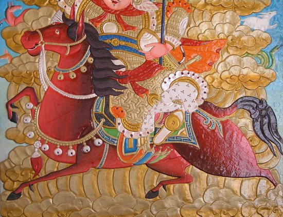 传说此马是“天上白天马、白地马所生。全身毛色赤红,在灵敏的耳朵上有一小撮鹫鸟的羽毛……此马与格萨尔一起降生人间,助其完成降伏妖魔,统一藏区的大业,后格萨尔功成圆满回归天界时,赤兔马也与其一起升天”。