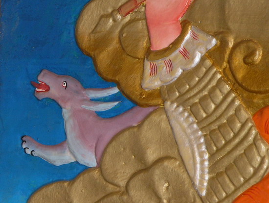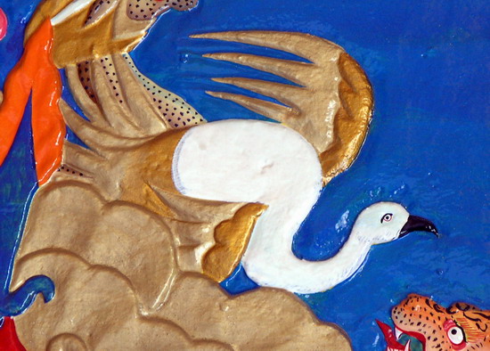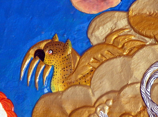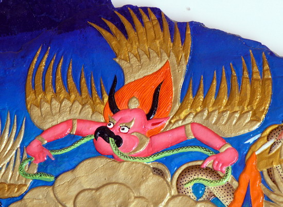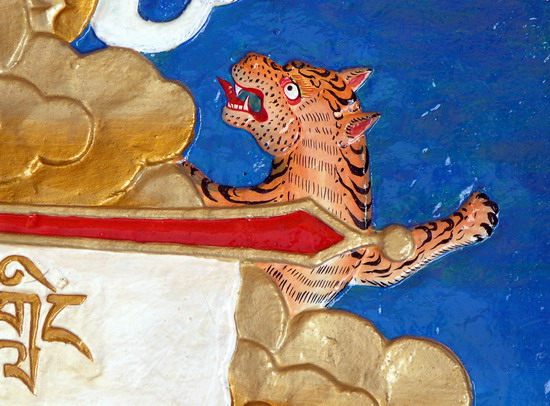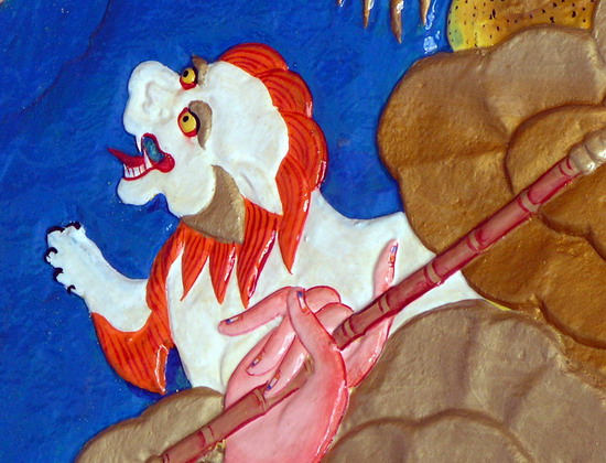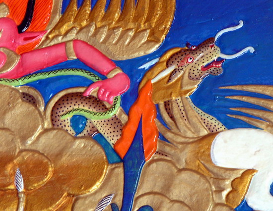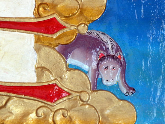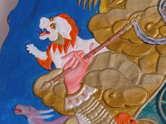 在格萨尔王的周围,还刻绘了十三畏尔玛战神,这十三畏尔玛战神分别是大鹏、青龙、红虎狼、野驴、青野、灰鹰、花鹞、白胸罴、白肩熊、金牦、野牛、长角鹿、白狮。