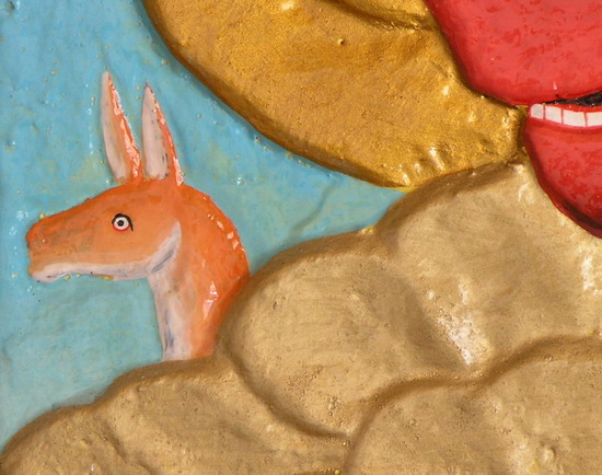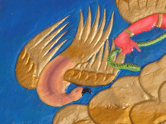 格萨尔王的造型,以骑马征战的艺术形态来表现。为了体现出格萨尔王的王者风范,除在衣着上进行点化,在面部表情上突出其刚毅与祥和的特点外,在幅面上所选板体比一般人物的板体大出一倍到两倍,在气势上给人以独尊之感。