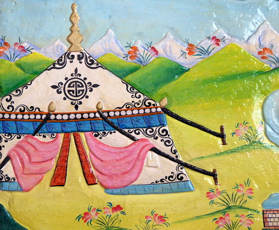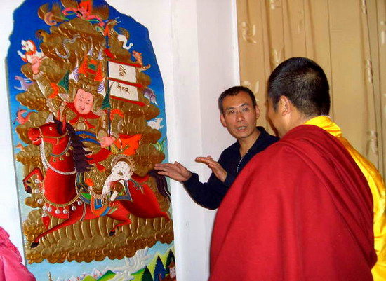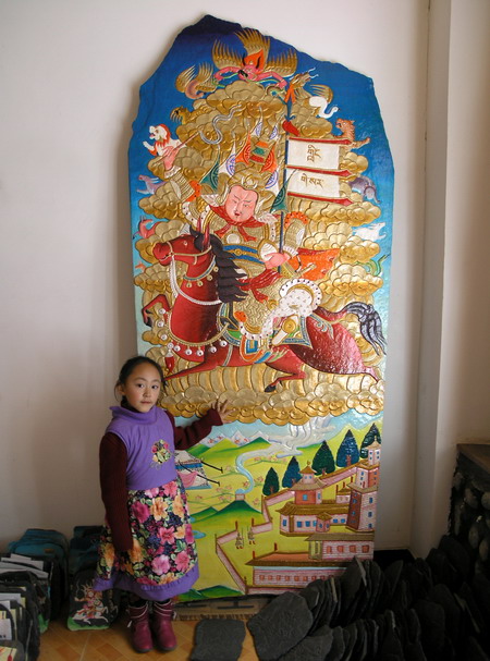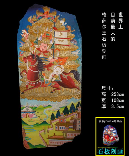 从草原寻找请来的格萨尔石板刻画的正宗传人,历时半年多才精心刻绘出这块精美绝伦、目前世界上最大的格萨尔王石板刻画。