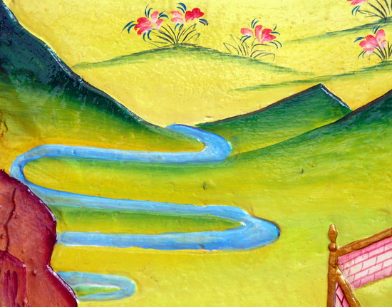 格萨尔石刻中还刻绘了背景,这种背景不言而喻充分显示出了青藏高原的地域特点,有草原、有鲜花、有森林、有高山,还有蓝天和雪峰,好一派雪域风光。这为石刻平添了鲜活的气息和艺术效果。