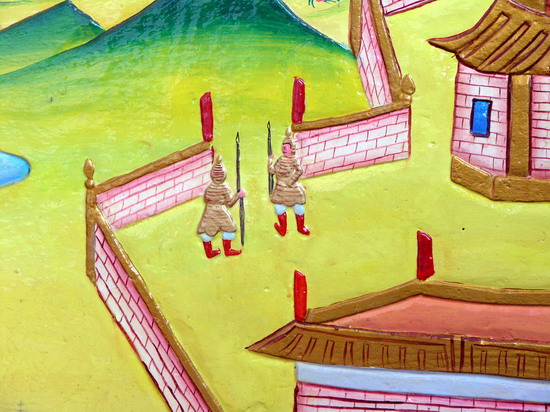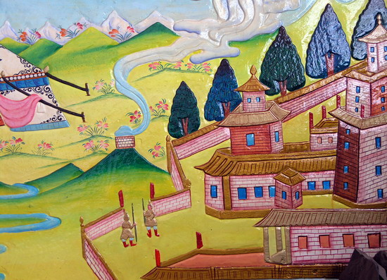 在这幅格萨尔王石板刻画上,还精心刻绘出当年格萨尔王征战时在青藏高原上修筑的城堡。