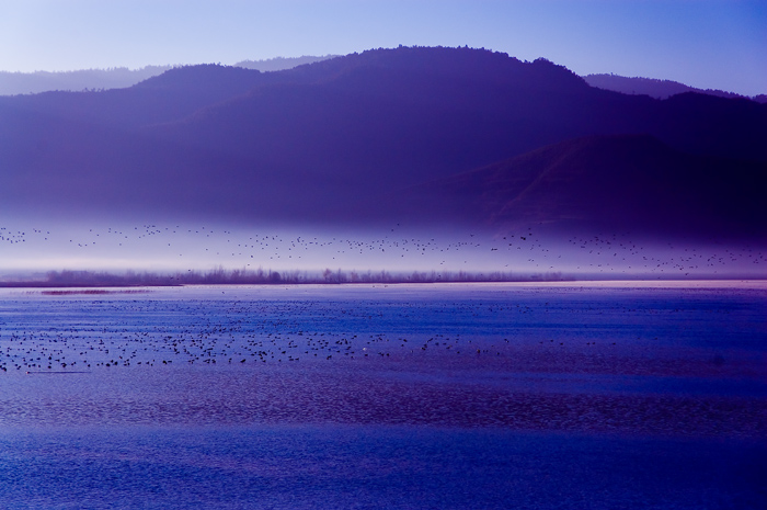 我推门跨出庭院,只走了八步,便来到了湖边。湖水在晨风里荡漾,这是个值得发呆的时刻。湖水涌起的时候,她们离我的鞋底是一寸,湖潮退去的时候,她们离我的鞋底是二寸。野鸭们早到齐了,还有一些红嘴鸥。或许它们根就就没舍得离开过,是在这湖上过的夜?远山是淡紫色的,泸沽是湛蓝的,群鹜在一抹淡白的湖岚里晨舞,点缀了林梢。