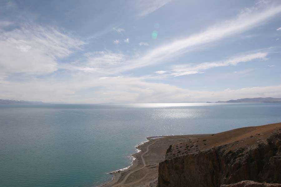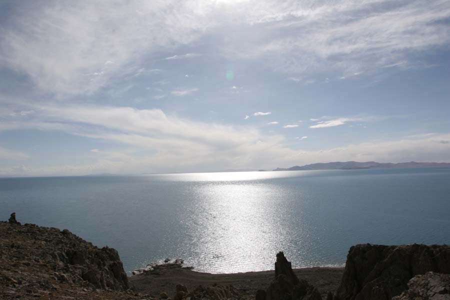 在小山上拍的纳木错西岸的风光,其时太阳正在渐渐的西沉,湖面一片银光。