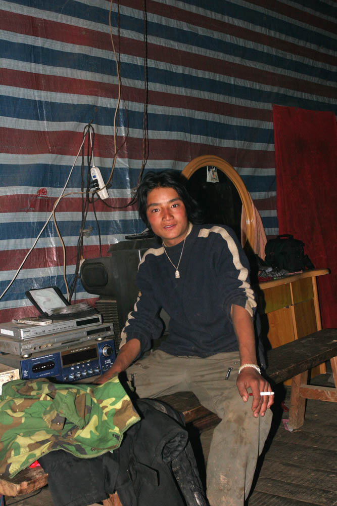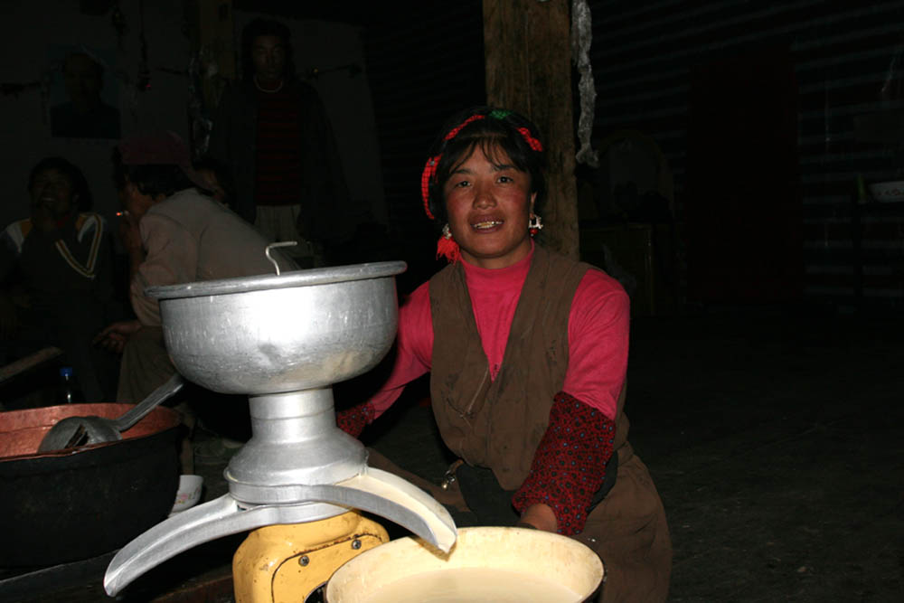 女主人——姆壤(译音,在我反复问了几次后,她的大儿子的发音依然是这个),正在做酥油。俺看了老半天也没搞明白,那个DD怎么就能把酥油从牛奶里分离出来涅……