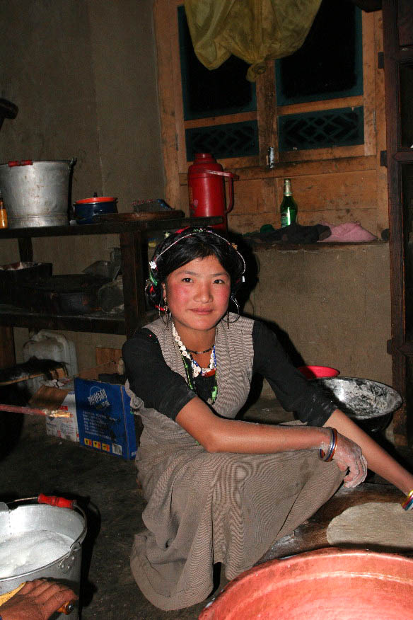 主人家的女儿——扎西央宗,很PL很能干活,我们吃过饭后都是她在收拾,并且收拾完后又活面,给我们准备第二天早晨的早饭——烙馍。