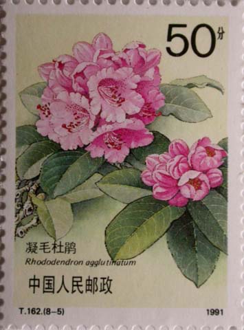 T·162·(8-5)图案描绘了凝毛杜鹃的神采。凝毛杜鹃为杜鹃花的品种之一。常绿灌木或乔木,高约2米~7米。四川木里县和云南丽江、维西、中甸、德饮县及西藏东南部的均有分布、生长于海拔3200米~4200米的高山针叶林下或自成群落。花期5月~6月。