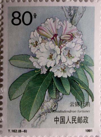 T·162·(8-7)大树杜鹃为中国珍贵的杜鹃花品种,被列为国家二级重点保护植物。常绿大乔木,高可达25米,直径2.6米,寿命约600年,为世界上最高大、树龄最长的杜鹃花,堪称“杜鹃花之王”。只生长于云南滕冲高黎贡山海拔2200米~2400米的常绿阔叶林中。在原始森林里,至今仍生长有直径2米~3米的大树杜鹃,树龄约在500年以上。大树杜鹃的叶片极大,长达24厘米~34厘米。