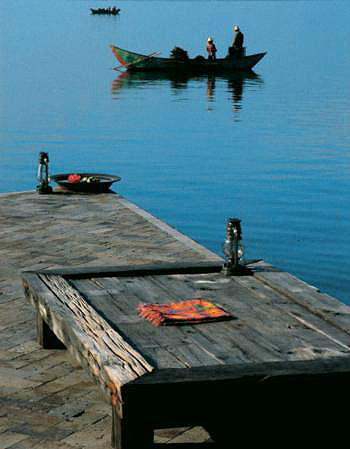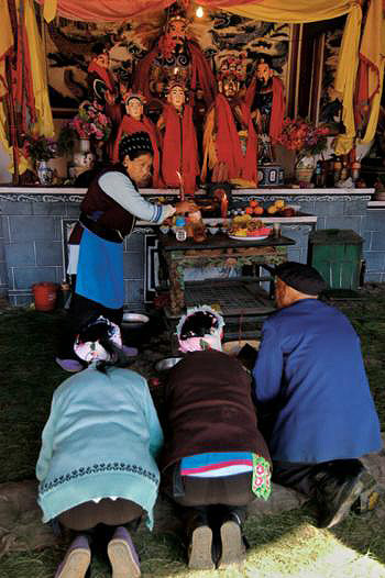 洱海像耳朵一样,镶嵌在大理苍山的脚下。白族人在洱海边打鱼耕田,千百年来过着宁静的日子。洱海沿岸的村庄里,有无数我们熟悉但又陌生的古老生活。穿过繁忙的滇西交通枢纽下关,走过游人如织的古城大理,顺着洱海一路向北,再折向东,就来到了双廊。当洱海西岸的下关在躁动中闪烁着灯红酒绿;大理古城洋人街的酒吧弥漫着各种情调时,东岸双廊的白族人家却依然像千百年前一样,过着本色纯真而静谧的生活。 双廊在洱海的东岸,背靠鸡足,西望苍山。白族人的传说中有这样一段话:“神说,这样的双廊还不够美丽。于是,清澈的洱海水在双廊转一个弯,再转一个弯,萝莳曲和莲花曲就像两条走廊,将苍洱间最美的风光演绎到极致。玉玑岛和小金梭岛,像一双巨大而美丽的鹿角,娉婷地伸进莲花曲,将洱海隔出一个天然的港湾。”双岛双曲的美景,让双廊这个名字,充满了令人遐想的意味。 本主崇拜是大理白族特有的一种宗教形式。本主是村社的保护神,是“本境福主”、“本地土主”的意思,也有人解释为“我们的主人”。大理的本主崇拜始于唐代南诏国时期,发展到今天,只要是白族聚居的村寨几乎都有本主庙。本主崇拜的对象和内容十分广泛和复杂,它包括了神佛、菩萨、龙王、君主、将军等各类神灵,还有民间传说中的英雄好汉,甚至连一些大石头、树疙瘩、猪、狗、马、牛都可以作为本主崇拜的对象。所以大理民间有“五百神王”的说法。有人戏称:“大理白族本主的神灵比希腊众神还要多。” 除了众多神灵,大理的本主节会也非常繁杂。不同的地方有不同的本主节日,比如本主诞辰之类。人们通常都会在固定的时间用固定的方式祭祀自己的本主。 在大理数不清的本主节会中,双廊的本主接送和本主庙会非常有特色,而且影响巨大。双廊的本主庙位于红山丫口,濒临洱海。所以这里的一大特色就是在洱海上接送本主。红山本主庙所供奉的本主为唐天宝年间大败唐将李宓的南诏军事将领王盛、王乐和王乐宽祖孙三代。被供奉为本主后号称“赤男灵昭威光景帝”。 每年的正月初四是红山本主的诞辰,人们很早就起来了,白族大妈将自己打扮整齐,蓝底白花的包头扎得一丝不苟,男人们已经备好了船只,准备前往红山的本主庙去接本主。天刚亮的时候,从大建旁村驶出的两艘大船已经绕过萝莳曲,到达红山的本主庙。而在红山的本主前面,早已摆好了供品,人们磕了头,举行了隆重的仪式之后,小心翼翼地将本主从神坛上请下来,放到大船上。大船载着本主塑像先到萝时曲的秋曲甸,让本主“赏花”、“阅兵”。然后船只再驶向双廊北海滨。在龙队、狮舞、霸王鞭舞队和唢呐锣鼓声中,本主被迎上岸,坐上两部木轮拖车。整个过程十分庄严,前面的人举着“回避”、“肃静”的黄牌,相继有黄罗大伞、金瓜刀矛等兵器和五色旌旗簇拥着本主的銮驾。 站在家门口翘首以待的人们纷纷激动起来,大家蜂拥着走向本主的塑像,村里的两个代表站在本主像后面,他们在本主的头上系上红绸,守护着本主。木轮车上捆着粗大的麻绳,村里的青壮年们拉着麻绳,拖着木轮车在村子里巡游。很多白族大妈密密麻麻地跟在本主后面。这时,各家各户的门前都已经摆好了香案和供桌,本主的车子一到,鞭炮声就响起来,人们举着香烛虔诚地向本主祭拜。拜完之后,就跟在本主的后面,继续往下走。在村里巡游一圈之后,将本主安顿在村中的寺院里,然后在本主前面摆上供品点上香,众人一起磕头礼拜。 本主接来之后,要在每个村子安放一个晚上,大家在本主像前祭祀礼拜,祈求村庄平安吉祥,风调雨顺。晚上,人们还会在本主像前唱曲对歌,演出自己编排的乡村戏剧,欢舞娱神。 在双廊的大建旁、岛依旁、康海和天生营这四个村子都要轮流接本主。第二天,邻村的人很早就将本主从上一个村子接到自己的村子,同样地巡游祭拜。每个村都接过本主之后,大家又一起郑重地将本主送回寺庙。 当本主像行进到玉玑岛时,村里跑出很多穿夹克T恤牛仔裤的人,他们中有许多光头,有些还留着长头发,虽然打扮不像当地人,但他们却跑在最前面,很激动地接上本主,拉着木轮车往村里跑,一路上高兴得不得了。这是一群定居在双廊的艺术家们。他们来自不同的地方,分属不同的艺术门类,有不同的艺术主张,但是他们都不约而同地被双廊所吸引,留在这里,不愿离开。赶上这样的民俗盛会,艺术家们当然是不甘寂寞的,跟着村民们一起出来热闹。村里的人早就习惯了这群人的存在,和他们一起拉着本主高高兴兴地进了村。在这样神圣、欢乐而热闹的气氛中,还有什么彼此呢?