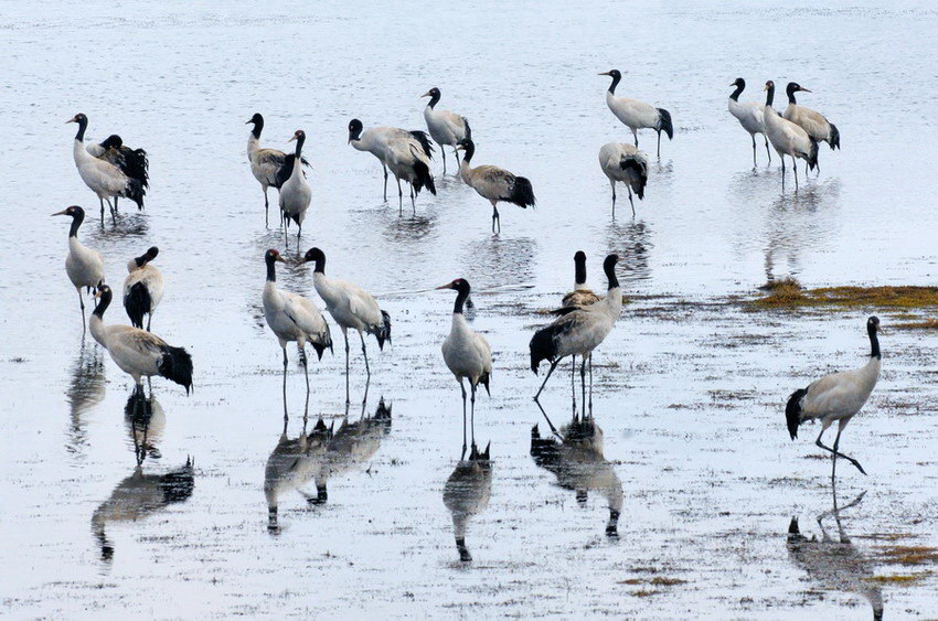谢尕说,黑颈鹤每年3月、4月来隆宝滩垒窝筑巢,4月底到5月初开始产卵孵化,多数一窝二枚,孵化期30天,雏鸟跟随亲鸟在滩上觅食嬉戏。到10月、11月高原寒气袭来,大鸟便带着儿女成群结队飞往云贵高原越冬。