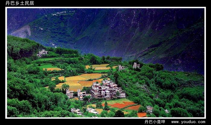 这是在横断山东部边缘丹巴县小金江的甲居村寨里。这里以矗立在小金江两岸错落有致、色彩缤纷、风格独特的嘉绒藏居著称。汽车从丹巴县出来,向小金江上游开了不到10公里,就到了甲居村所在山脚下。从左边上山,汽车绕过无穷多的“之”形山路,直到站在公路边向山下的深谷望得令人发晕,才终于到了我们的目的地。