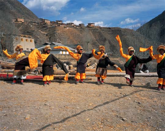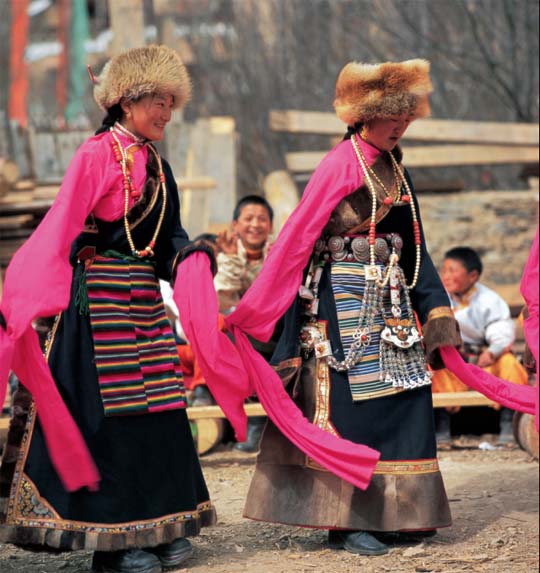 表演锅庄时,通常舞者围成一圈,中央铺着一张色彩斑斓的藏毯,上摆放着人们喜爱的青稞酒和食品等。参加锅庄表演的人数不限,舞者分男女两队,每队皆有领舞者一人。领舞者必须具备丰富的表演经历、智多识广,而且动作娴熟、舞姿优美、嗓音响亮。男女舞队在领舞的带领下,随着清亮悦耳的歌声,广舒长袖,翻然起舞。舞者服装不求统一,只求富丽堂皇。舞者身穿的名贵藏装,大都是用水獭,豹皮镶边,佩以金、银、珊瑚、玉等珍贵饰品,既显示了家庭的富有,也为舞者增添了光色。