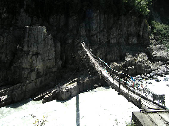 提到吊桥,就多说几句。以前是没有桥的,过江全靠溜索,溜索这玩意儿没溜过但见过,感觉上就是一溜出去就只能听天由命了,也就只能相信溜索和溜具是安全的了。到八一之前,队中大多数人当然也包括我自己,是很有些担心溜索的。现在,溜索已被吊桥代替了,虽说吊桥有些简陋,也就是几根钢丝固定在两岸的岩石上,上面铺上木板而已,但比起溜索来已经安全得太多了,起码你有脚踏的木板,手扶的钢丝。现在,从排龙到扎曲,新建了5座吊桥,最长的有500~600米。