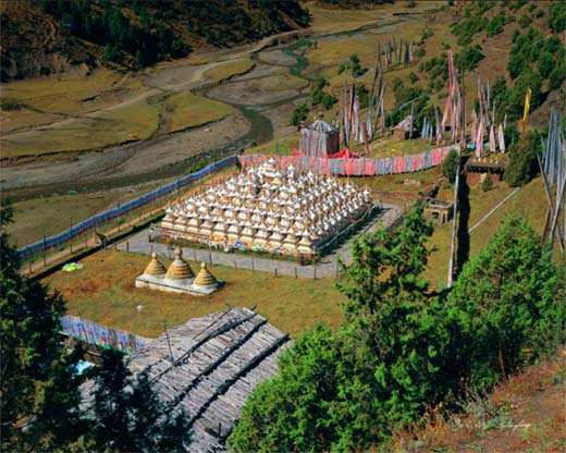 拉日马之美,美在人文。或许是地名就笼罩着一股神秘浪漫色彩,小镇拉日马被浓浓的地方人文特色包围着。小镇神奇古朴;一条惟妙惟肖的祥龙山脉静卧镇边,龙头恰好位于镇头,护佑着整个小镇,使小镇成为一块祥瑞宝地。或许,在大多数人信教的康巴地区,浓厚的佛教文化色彩并不罕见,但在小镇拉日马却异常浓郁。镇头,耸立着一个石刻大藏经《甘珠尔》彩色佛塔、一个尚未完工的刻着1亿遍六字真言的石片砌成的佛塔和一些其他的塔林,这里便成了村民们的宗教文化活动区,据信教群众讲,绕着塔走一圈就相当于默诵一遍《甘珠尔》,1亿遍六字真言。每天,镇里的老人和一些外地的信徒都到这里转经。小镇西头,还有一座在康巴地区独一无二的由113个佛塔组成的佛塔群,也吸引了不少的信徒,成为一道极为亮丽的风景。小镇位于森林怀抱中,小镇人修建房屋时却一例在房顶上盖上了就地取材的青石板,使小镇成为一个名符其实的石板藏寨,显得古朴端庄,特别是雨后初晴,阳光反射在还带些水露的青石板上,小镇便被一种闪耀的波光罩着,仿佛一个天外世界.