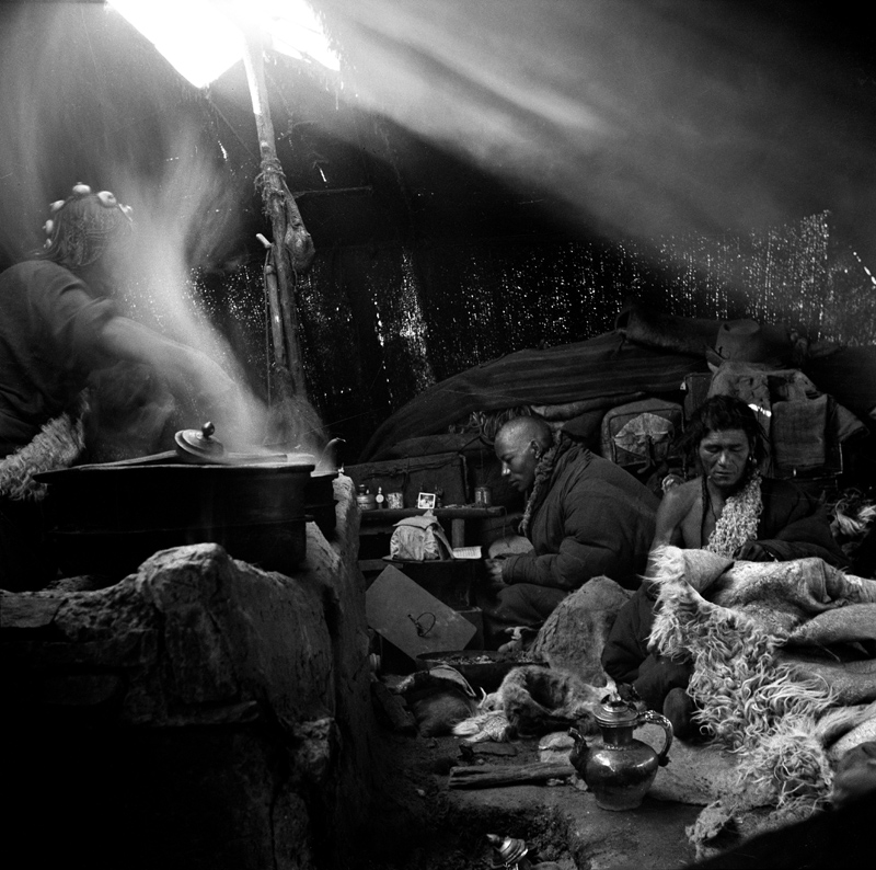 1937年由青海玉树南下途中,在石渠牧人的帐篷里拍下了这张“牧民的帐篷”。帐内陈设,中为土灶,右边为主人坐卧之地,与汉人的习俗一样尊左为上,左边上手喇嘛在念经,下手缝工在做皮裘,右边主妇在煮茶,上面雾气缭绕,下面陈设依稀可变,典型浓重的牧民生活情景。