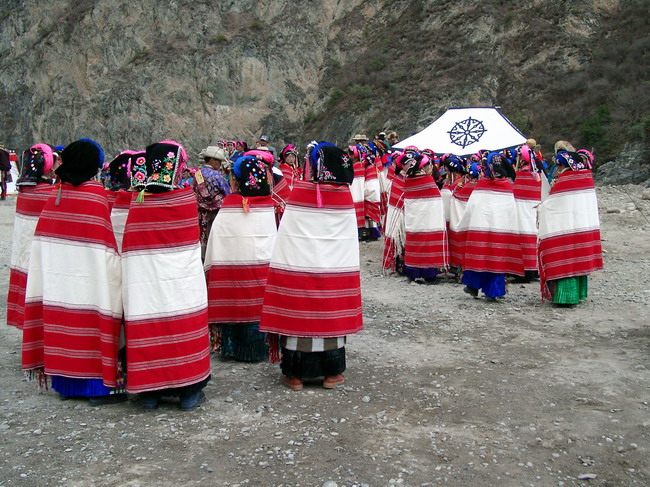 (相传,“燃巴”是这样得来的:古代,有一位高僧路过此地,见山川丰美,有如纯洁的仙境。可是高山险恶,妖魔横行,百姓生活十分艰难。激动之中,高僧伸手撕下了天上的一片彩虹,化做五彩的“燃巴”,披在百姓的身上。红色象征太阳,白色象征月亮,蓝色象征江河,黄色象征庄稼,橙色象征星星。有了“燃巴”,有了五彩的光辉,人们不再受妖魔的肆虐,过上了幸福美满的生活。清人李心衡在《金川琐记》一文中曾对“燃巴”作了这样的描写;“衣服之外,横披大幅长毯,若释氏袈裟……”舞动的百褶裙,耀眼夺目的亚嘎燃巴,不仅流露出东女后裔的万种柔情,更展示出嘉绒风情的别样韵味。)