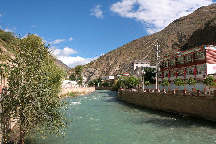 一路走来,路真的是满好走的,尽管有些路是土石路,但还算平整,并且有好长一段路是沿着金沙江走(江的另一岸上的路就是去梅里的,直到过了奔子栏后,两条路才互相看不到了),在到达得荣前,路上的风光一般。可从得荣——乡城这段路,风景简直美极了,路两侧山上的秋色已经很浓了,红黄绿相间的树林、偶尔出现的在河谷低洼平地上的村庄、以及那在河谷里欢快流动着的、异常清澈的、不断地“S”着的小河,唉,非常可惜,如果是包车走的话,那可不知要让司机停多少次车了,可如今,只能是用眼睛当镜头、用大脑当底片了,hehe……,强烈建议各位XDJM,当在这个季节走这条线时,最好包车。