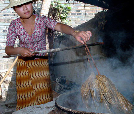(芒团村傣族姑娘玉芳在煮构树皮)