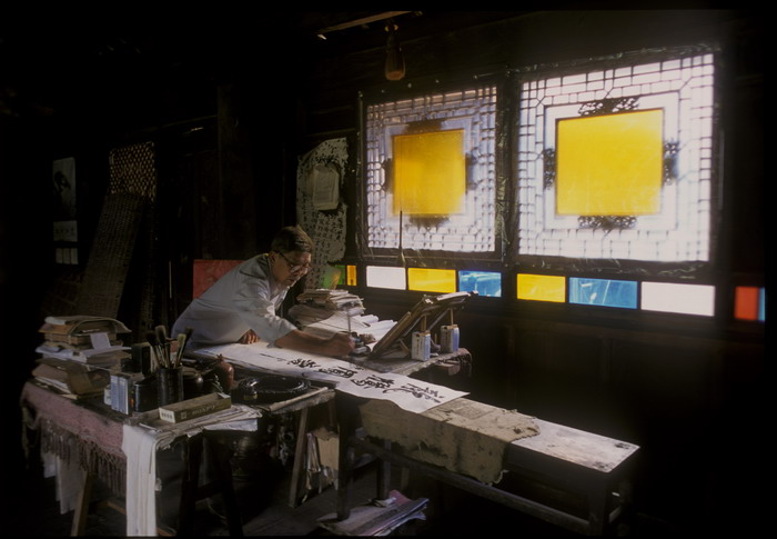 当最后一末夕阳将光束送入和顺一户张姓宅院的二层书房里,我十分惊诧“亦农亦商亦儒”的生活在此活生生展现,雕花精美的中式窗棂上镶嵌着进口彩色透明玻璃,老式书桌上摆放着文房四宝,房主是一位七十的老人正在临一古帖,他专注的神情根本就无视我一个异乡人的贸然闯进,书房外二层平台正对着盛开的一片荷塘,平台廊檐下设有低矮的床塌,可以遥想当年房主人一定也这般悠然而闲暇......