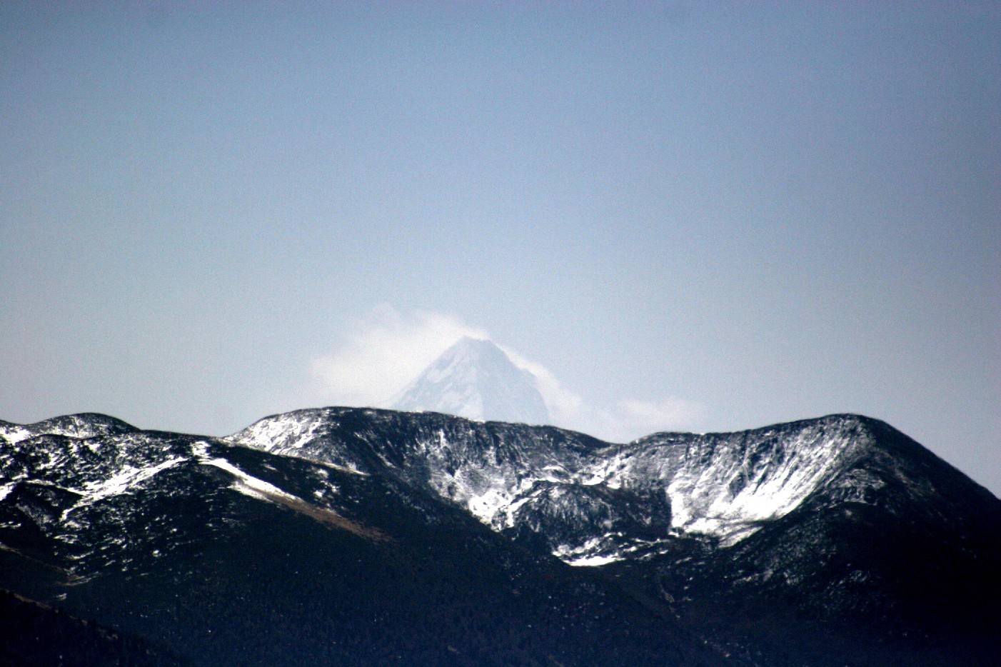 贡嘎雪山在一个古老的火山口后面露出一个小小的尖顶,与佛母寺的直线距离约为150公里。