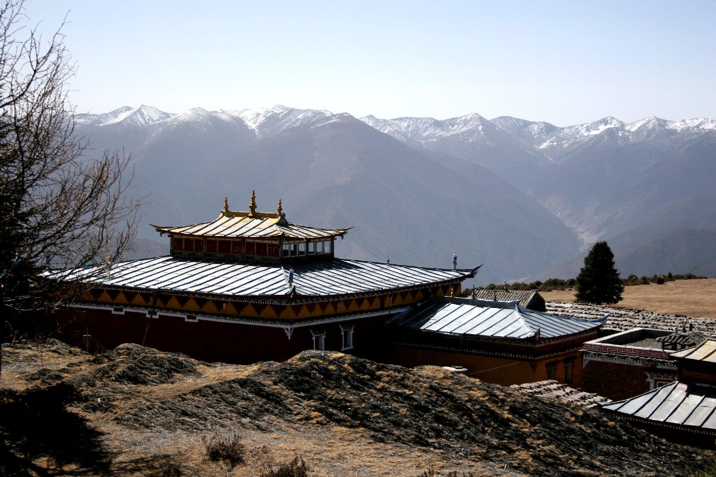 这条十二公里的泥巴小路围着山沿往上行走, 是什么人把这条不起眼小路修得这样平直呢? 在这种偏远的地方有这样经过精心修整的小路是完全不可能的呀! 不管怎样, 只见它钻过浓郁的松林往山上盘绕, 一会儿, 八角楼乡那秀丽的小村就象珍珠盘似的出现在山脚下的视野里, 刚才走过来的大路和村庄不断往下沉降, 四周的山川和峰峦立即围过来, 不一会儿, 下面的路和村庄就变成了一条在崇山峻岭中横穿而过的峡谷, 我跟着这朵美丽的白云, 视野越来越宽阔, 地形越来越清楚, 四面的高山群, 全在四千米以上, 他们围成了一道圆形的,只有视野才能达至的山川壁垒, 这壁垒以外就是蔚蓝的天空和苍穹, 而壁垒内面的山坡则缓和地向中心聚集, 山坡上原始森林里的茂密松树形成了一朵朵盛开的莲花瓣, 而在这花瓣的中心, 一座4106米高的雄峻山峰拔地而起, 她立于莲花的中心, 自身又伸出八条伏行向前的山脊联起周围的大山壁垒, 在主峰的右边, 有一个高耸入云的开阔坝子, 坝子上有一个宏伟的寺庙和飘飞的经幡, 这朵白云就停在了那里。