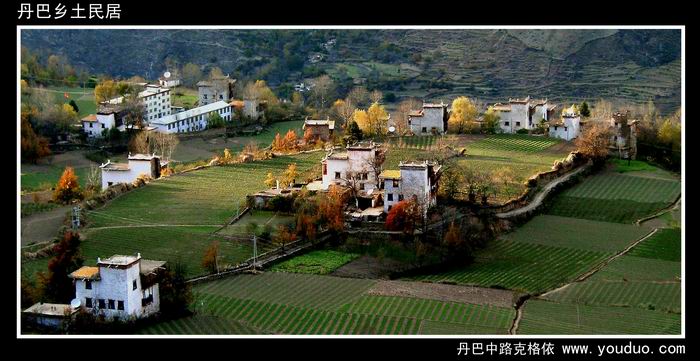 这是在横断山东部边缘丹巴县小金江的甲居村寨里。这里以矗立在小金江两岸错落有致、色彩缤纷、风格独特的嘉绒藏居著称。汽车从丹巴县出来,向小金江上游开了不到10公里,就到了甲居村所在山脚下。从左边上山,汽车绕过无穷多的“之”形山路,直到站在公路边向山下的深谷望得令人发晕,才终于到了我们的目的地。