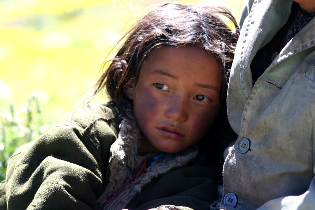 她脸颊有两块红得发黑的高原红, 黑红的脸庞和颈子上带的绿松石的鲜艳颜色形成了美丽的画面, 她的眼光述说着高原上的一切, 这个高原带给孩子们的是一种原始的苍野和自由, 她在一个陌生人面前, 展现了好奇和羞涩的交织, 她像一个藏族的小公主一样美丽动人, 她像一个幼小的精灵陪伴着这美如图画的山川和草地。