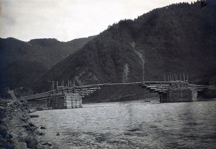 这张照片是1911年6月,英国的植物探险家威廉·珀道姆William Purdom 到中国北部和西部进行植物考察时拍摄的,他在图片上的说明是在甘肃卓尼附近的洮河上拍的,但我怎么看怎么都像是我多次去过的新龙波日桥。