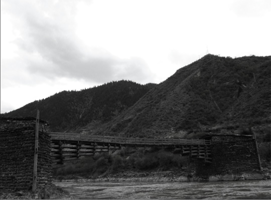 横断山脉中的木制悬臂古桥