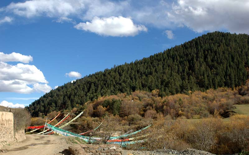 在这种自然深度里,让自己的灵魂和故乡神座相互融合,便能极尽所致的体味领略这遗落在亿万年间的秋韵了。于是用手摸用脚登用眼看用耳听用嘴尝用心体会用全身的血液和神经度量的也就是这故乡神座的秋了。可以伸开自己的五指来印在藏寨民居的墙壁上,红绿相间,雄奇崔嵬,这也许就是奔流于故乡父老乡亲们胸中的血性罢。可以迈开脚步,在与秋风的耳鬓厮磨里去登临村子对面的高山,一路登高,每上一层石阶,也便提升一种心境,此时可以把日常生活中的所有烦忧一股恼儿倾泻在这陡峭的秋里,只留下恬淡悠远在心间。可以张开乌黑的瞳孔去极力捕捉故乡神座的影子,看那层林尽染的壮美、秋日黄昏的辉煌、千仞绝壁的艰险。可以站在扎嘎沟的绝壁栈道上听林涛翻涌的澎湃、秋风低诉的呢喃、大雁南归的呼唤。其中,数这秋风最让人不舍,它总喜欢狂欢而来呼啸而去,环绕于身前左右,随着在身后让峭壁把那不带一丝烟火和尘埃的干净裁剪得更加有棱有角,铿然作声。也可以张开你干涩的口唇,顺手采摘一枚熟透的野果子,将其果肉放进嘴里,任香甜一直滑入你的心里,来滋润你久已干涸的心湖。
