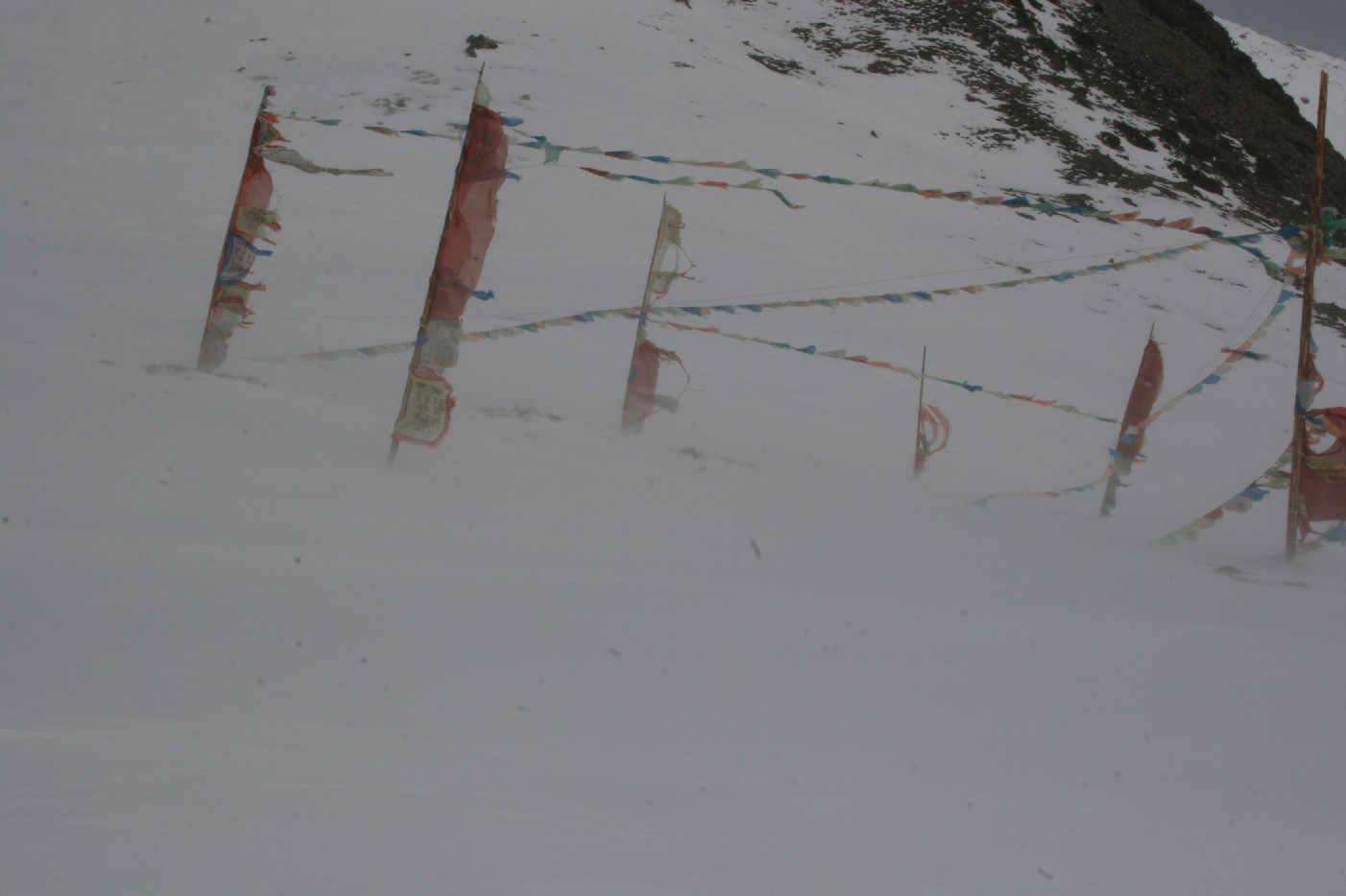 正午过后的峡谷风会越来越大, 它们到达5千多米高的丫口时至少也有七八级的风力, 丫口上除了几根经幡以外, 全是光滑的雪坡, 稍不留意就会被扫下峡谷, 我定下神来在周围看了看, 好在此时已是四月中旬, 丫口上的雪坡表面上只有一层薄薄的冰, 用脚使点劲, 可以在雪地上插进小腿的一半, 这样足以在狂风中稳定身体, 不至于被扫下空旷和深邃的峡谷, 于是, 我打定主意,在近乎雪盲的状态下, 顶着不断击来的雪粒, 用双脚对着雪深的地方捅出一条路, 连滚带爬地逃离了丫口, 一头扑在了丫口边的一片深雪地上, 这里的风速已经大大的小于丫口上的, 这里已经是安全地带。
