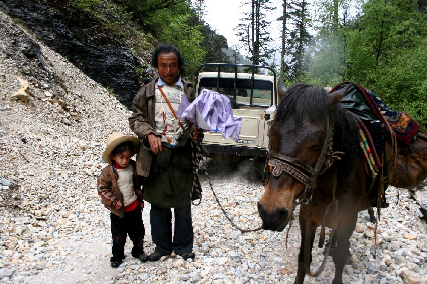 翻过米拉山就进入了盖玉乡, 狭窄的小路, 荒野的原始森林, 突如其来的暴雨, 难免使人不想象在这里遇到夹坝的可怕场景, 在这里遇到了什么人是绝对没有什么地方可逃的, 山太高, 飞也难得飞上去, 林子密, 钻也钻不进去, 河又小, 想跳河都没法跳, 这是一跳下去就可以站起来的那种小溪, 我正在想着这件事, 突然前方出现了几匹马, 不见人, 我们赶紧刹住车, 下车看个清楚, 原来是个叶巴村的汉子带着他的孙女上山去, 小孙女才五六岁, 她刚刚从马上摔了下来, 满脸是血, 他爷爷把她扶上马, 还要继续上山去, 我看她那样, 觉得应该去盖玉乡的卫生院去上点药, 这样在雨中继续爬山弄得不好会感染伤口, 我就对那个汉子说, 我们的车可以带她去盖玉看伤口, 那个汉子摇摇头, 赶着马继续往前走, 我赶上去, 拿出一点钱交给那个汉子, 让他到山下的村子里, 在小卖部给这娃娃买点糖, 我眼看着他们在大雨中朝着米拉山主峰走去, 心中难免为这个小妹妹担心。