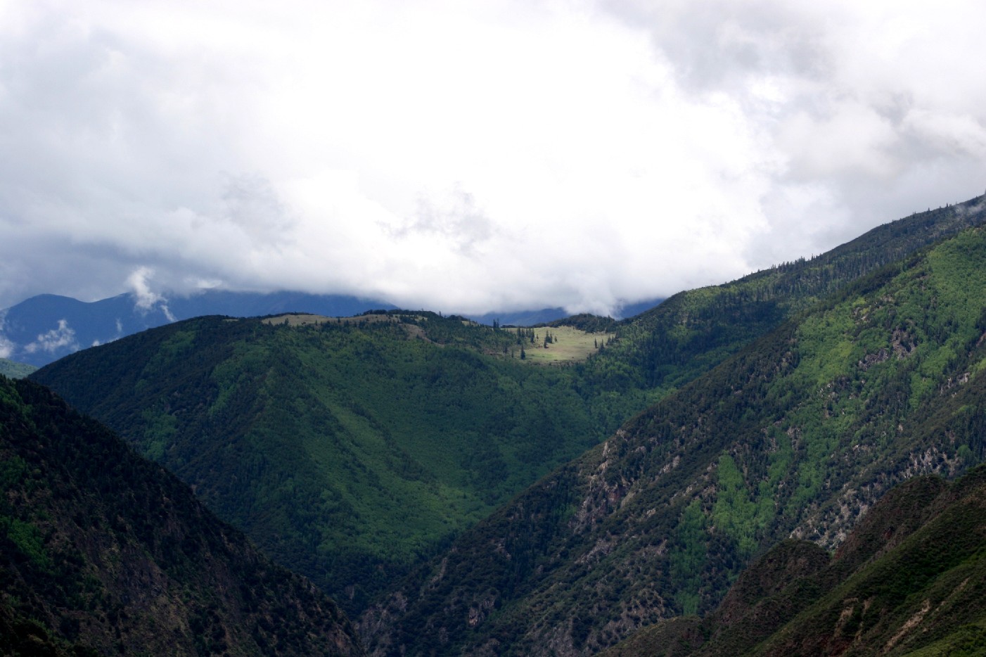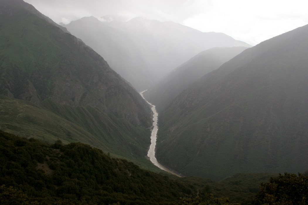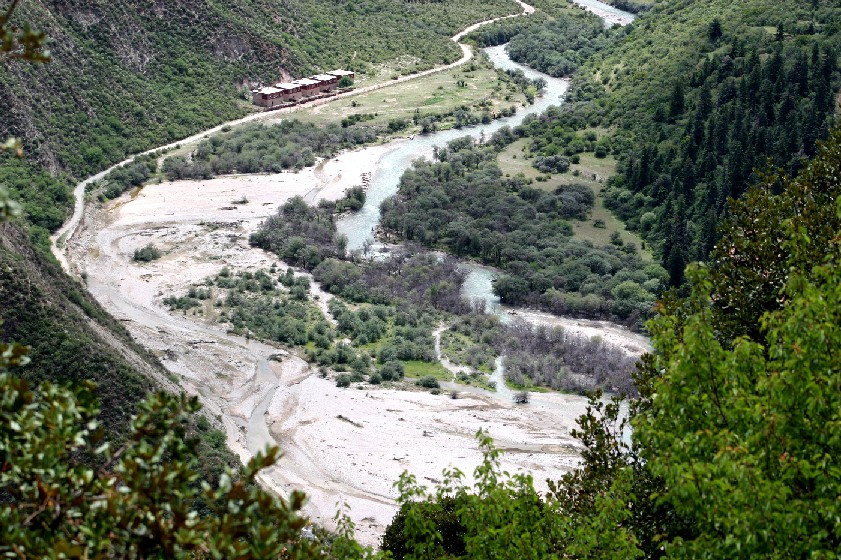 穿过叶巴村就来到了峡谷口, 这时候, 我难以掩饰内心的激动, 六月的江水虽然不大, 看不到长漂英雄们所描写的那种大跌水, 深旋涡, 和卷皮浪, 但是那峡谷, 却是依然让人感到山河的骄傲和伟大, 金沙江在叶巴村旁拐了个近九十度的弯, 形成了一个宽阔的峡谷空间, 金沙江在这里来了一弧形的转弯, 从山顶看下去, 一切正如当年的长漂英雄们所描写的那样: