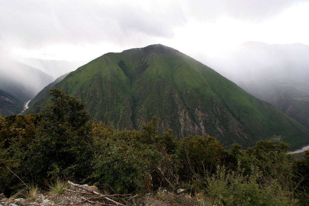 在米拉山的丫口上, 我们被对面掩藏着迷雾之中的盖玉方向的一座大山的苍劲和荒蛮所震撼, 这就是叶巴所在的, 海拔5074米的娘夏卓山, 可惜照相机没有能够拍出那种效果来, 更令人惊奇的是, 回来仔细看了长镜头拍的照片才发现的, 原来这两座山的主峰都是近代的火山口, 从峰顶流出的溶岩表层的光洁度来判断, 这两个火山口最多不过数百年的历史, 不过这两个火山口喷发时的力度有限, 溶岩流到半山腰就停止了, 但无论如何, 这似乎是此次进山的一个新的发现(如果别人还没有发现的话), 90年代出版的白玉县志上并没有提到这两个火山口。