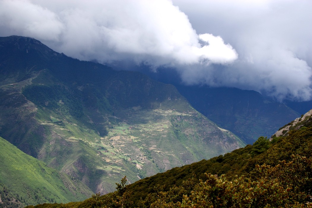 车子下山后, 我们在密林的小路跑了将近二三十公里, 在一个叫如苏的村子朝由一拐, 就上了去叶巴村的山崖小路, 只有这时才能真正看出洛嘎那非凡的车技, 他把车在悬崖绝壁上开得飞快, 连开了二十多年大卡车的喻师傅也惊叹不已, 每到一个悬崖转弯的尽头时, 车好像就要朝着云层冲过去一样, 但这时只见他猛地一打方向盘, 再一拉加力挡, 车就回过头来, 吼叫着转上另一个弯道, 我看着山下的峡谷越来越深, 我们已经接近了悬崖的顶端。回过头来, 只见立于山顶的坡坡上的叶巴村出现在眼前。