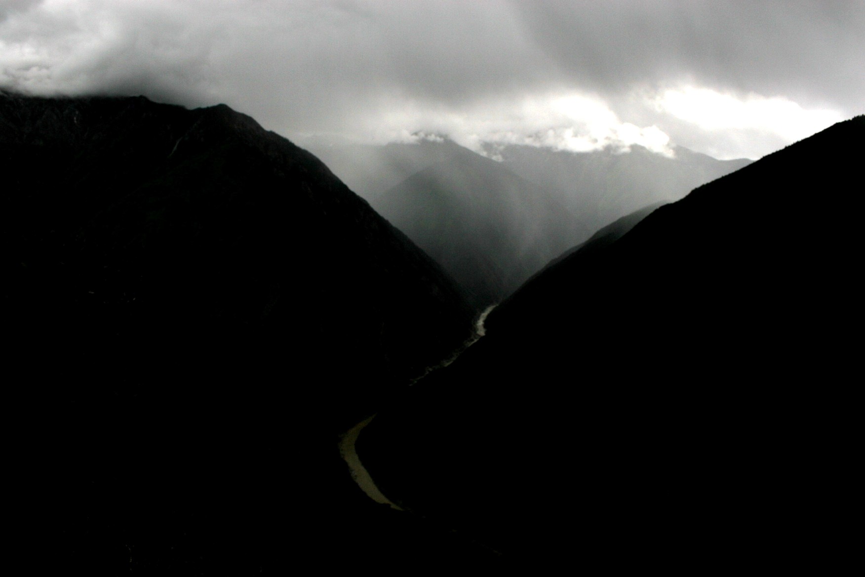 具有神灵的山河, 好像要给不远万里的来客重现历史的辉煌和气势一样, 只见一朵巨大的乌云开始在对岸西藏方向的山坡上聚积, 不到几分钟的时间里, 它就覆盖了整个峡谷, 大江的上空出现了黑色的云雾, 它们向下压下来, 整座峡谷顿时黑了下来, 只有在这样的光影下, 江水的波涛才有了险滩的背景, 大雨顺着白色的雾帘飞进了峡谷, 一阵大风吹动了满山的树木, 山河在一瞬间从一种安宁的静态, 转化为风起云涌, 山雨骤来的动态, 在大雨和黑云扑向峡谷下面的江面时, 我的思维回转, 过去书上看的, 耳边听的一写有关长漂的故事, 重新组构, 我仿佛看到了两条插着鲜艳的国旗的漂流艇, 他们迎风破浪, 顺流而下, 在波涛中一起一浮, 当年长漂英雄们那朴实无华的英姿出现在我眼前。