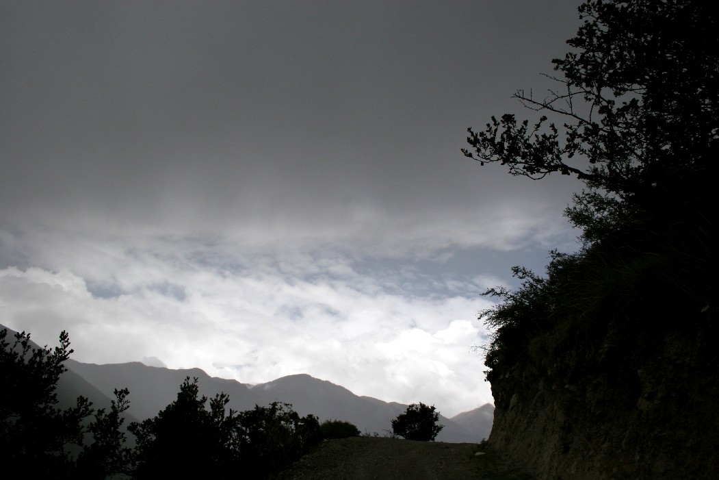 大雨停了, 峡谷又安静下来, 阳光透过云层射向了峡谷和悬崖上的小路, 我从沉思中回到现实, 抬头望见叶巴村头面对大江拐弯的山头上, 有一个由村民们立的经幡塔, 那是为纪念在叶巴险滩遇难的三位勇士而立的纪念塔, 也是村民们为祈求大江的风调雨顺而立的经幡塔, 在雨后的霞光里, 这个具有强烈象征意义的经幡塔, 以庄严和撒脱的姿势面对峡谷, 仰望天空, 俯瞰大江, 她们在山口上迎风飞舞, 展示出一种独特的边关意境, 他们日夜祈祷, 歌颂着那些曾经为了理想而英勇献身的英灵!