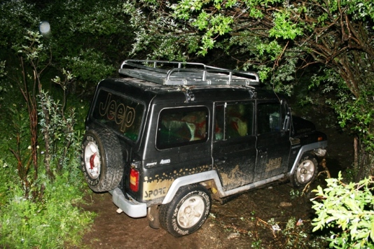 我们的车陷在了一条小河沟里,前后的坡都跟陡,进退两难,只能停在河沟的中间,让沟里的水从前后轮中间流过,糟糕的是,小河沟被浓密的灌木盖住了,车周围连门都打不开,洛布用藏刀看开右前门外的树枝,门可以勉强打开,可是一开门落脚就是半尺多深的水,从黄昏时刻,两个经验丰富的司机就在想着各种办法脱离这个困境,前坡又高又长,根本冲不上去,后坡有短又陡,退也退不回去,山里下起了大雨,前后坡越来越滑,洛布跳到水里到沟边砍了许多树枝垫在车轮下也无济于事,小余干脆将洛布从家里带来的被子裹在后轮上也没有办法,折腾了一两个小时以后,大家都累了,天也完全黑了,阿杰说,今天晚上就在车里睡吧!他说完,把座椅向后一倒,仰头就睡了,小余和洛布在后面的座位上把东西挪了挪,他们也开始睡觉了,我坐在驾驶员边上的前座上,在伸手不见五指的黑暗中,木然地感受着这个恶梦的空间。