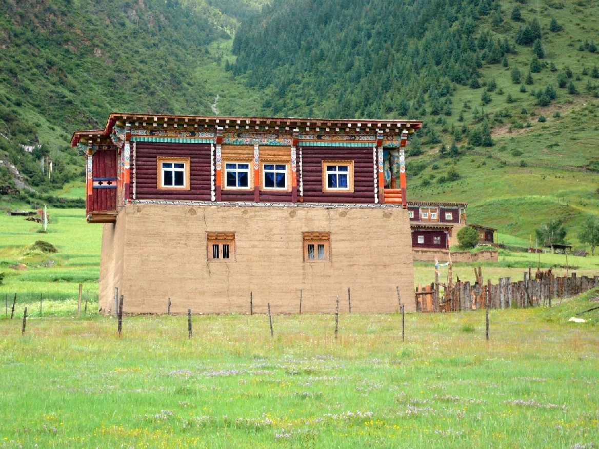 在然本村, 一座漂亮的藏房立于花草和青稞包围的山坡上, 底层高大宽敞, 上层雕刻精美, 绚丽的色泽和柔和的环境融为一体, 所有的内外屋柱全都用了精雕细刻和彩绘, 劳动和生活的空间既区别分明, 又融为一体, 屋外, 一头牛犊悠闲地坐卧在草地上, 不慌不忙地等待着黄昏时主人来吆喝着让它回牛棚。