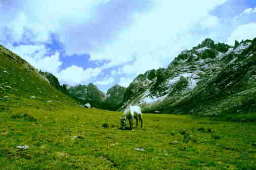 我们驱车到达扎尕沟口时,已经是下午3点钟了。从这里出发,我们就得骑马前往扎尕沟。迅速将几天的生活物资从车上卸下后,又庚即用牦牛驮上,一行7人再加上赶马的4人共计11人,便一路欢歌地向扎尕沟进发了。这里距离今晚的宿营地还有12公里的崎岖山路,我们必须在天黑之前赶到扎尕湖下,并在那里下帐篷。