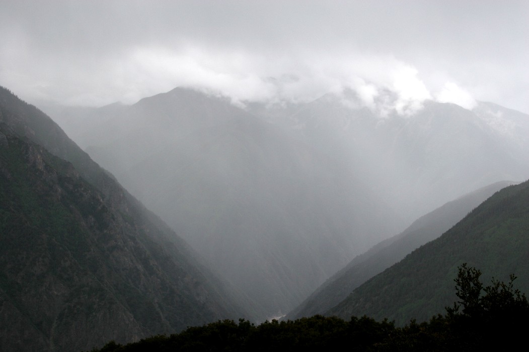 具有神灵的山河, 好像要给不远万里的来客重现历史的辉煌和气势一样, 只见一朵巨大的乌云开始在对岸西藏方向的山坡上聚积, 不到几分钟的时间里, 它就覆盖了整个峡谷, 大江的上空出现了黑色的云雾, 它们向下压下来, 整座峡谷顿时黑了下来, 只有在这样的光影下, 江水的波涛才有了险滩的背景, 大雨顺着白色的雾帘飞进了峡谷, 一阵大风吹动了满山的树木, 山河在一瞬间从一种安宁的静态, 转化为风起云涌, 山雨骤来的动态, 在大雨和黑云扑向峡谷下面的江面时, 我的思维回转, 过去书上看的, 耳边听的一写有关长漂的故事, 重新组构, 我仿佛看到了两条插着鲜艳的国旗的漂流艇, 他们迎风破浪, 顺流而下, 在波涛中一起一浮, 当年长漂英雄们那朴实无华的英姿出现在我眼前。