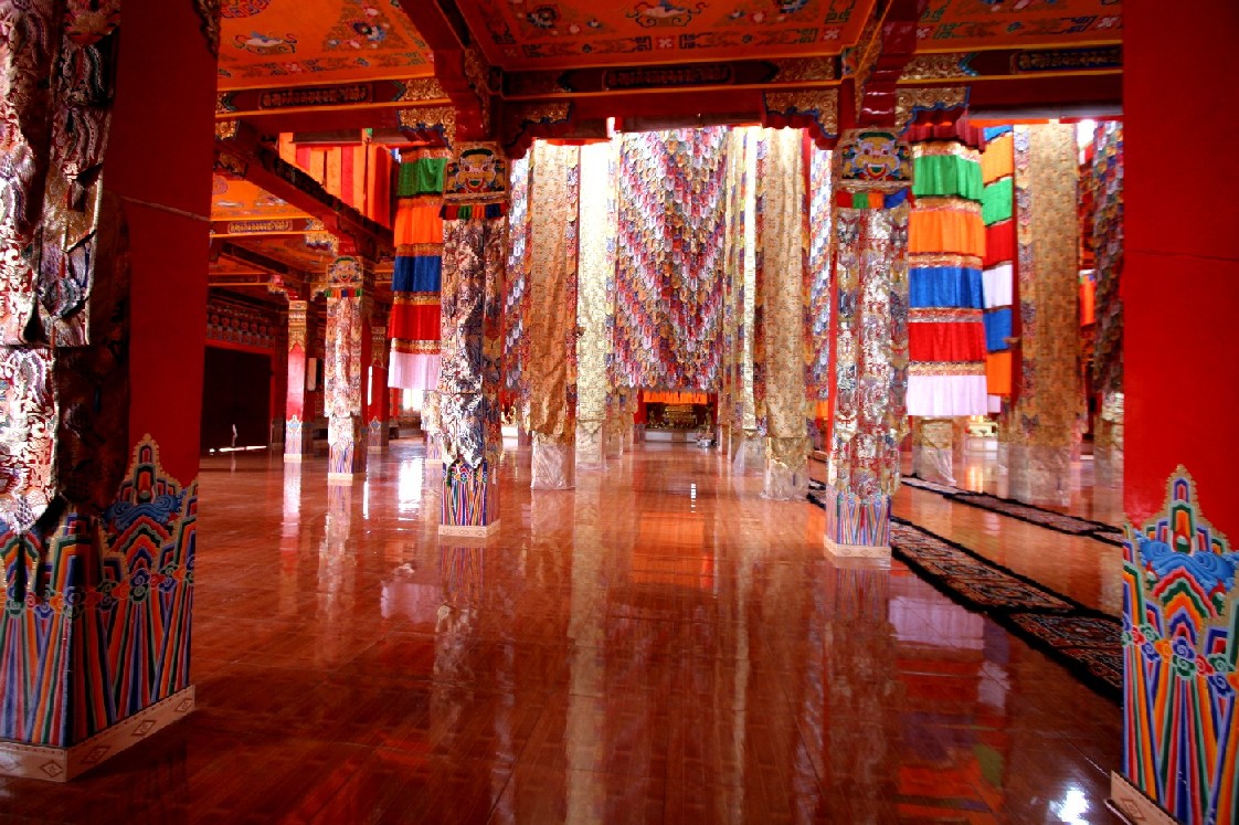 这时, 我抬头看见了一个年纪小小的觉姆背着一个大包糌粑走上坡来, 她看见我, 笑了笑, 用手指了一下山下的大殿就走了, 于是我朝着大殿走去, 发现里面居然布置得如此辉煌华丽, 巨大的幡憧悬挂在大厅, 俨然像是一个艺术的宫殿, 我钻进了一个幡憧, 抬头向上, 阳光透进来, 形成了一美丽的蔓托罗, 我换一个幡憧, 又一个蔓托罗, 一个比一个新奇, 一个比一个神秘, 我在不停的仰望中感觉到一种晕眩, 我的梦开始旋转, 变化, 我在旋转中飞翔, 我的头又开始发胀, 我又开始缺氧了, 这是梦, 还是真的? 我自己也不知道, 如果是现实, 我会怀疑, 如果是梦, 我会更加相信眼前的一切, 亚青寺, 在短短的二十年里一跃成为康区,藏区最有影响力的寺庙之一, 一定有她的神奇之处, 与其用现代人的眼光来打量或错误地评论她, 还不如让她在梦境里继续保持那种神秘的光芒和模糊, 这里的许多事情, 看上去比我们所处的物质世界落后, 但他们在精神上绝对超前于我们许多许多, 这里的许多道理, 也许我们永远也不会理解, 不会懂得。