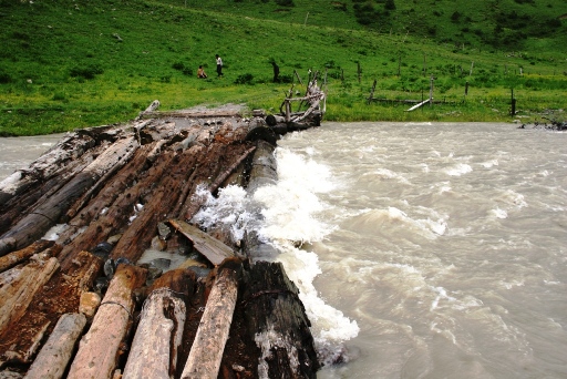 到了麻绒乡然本村我们没有找到村长,路边的洛布却自告奋勇地出来给我们当向导,一天一百五十元向导费,找了他带路是个极大的错误,因为他对前方的路况并不熟悉,哪儿有鹿子他也好像并不清楚,我们就这样稀里糊涂的冒着雨,把车开过了第一座危桥,就遇到了那个小河沟的时候,地还是干的,所以借着冲力我们就过来了,第二座危桥更险,上涨的河水已经漫过了桥面,桥下面的洪流把桥面的圆木冲得往上拱,很显然,河水再涨一点,这座桥就会被掀翻,冲得一干二净。