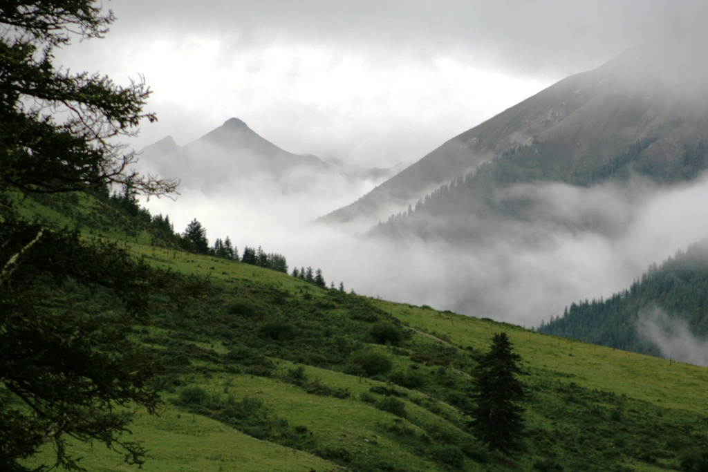 越过第二座危桥以后,我们来到了一个开阔的草坝子,草坝子上有一片火烧过了林子,火烧林那稀疏的布局和棕褐色与茂密的原始森林和草地的翠绿形成鲜明的对比,在夕阳的照耀下它现出一种苍茫和凄凉,草坝子以较为缓和的坡度想山上延伸到云端,黄昏来临时,一片片漂浮的云彩慢慢连成一片晚霞,对面山上即将要落山的夕阳将山顶上森林里参天大树的影子投射到对面山上的草地上,就像是在柔软的草毯上不经意地勾画着一副副水彩,麻曲河在草坝的下面绕了几个弯,继续咆哮如雷地向着下游奔腾,而顺着麻曲河冲出来的方向,我们看见一座巍峨的大山,山的脚下有两条河相会,形成了一个三叉口,一条就是麻曲,而另一条则是麻曲的支流,它来自更深更远的辛果隆巴(当地话里,隆巴就是山沟的意思),里面有跟多大的温泉群,辛果隆巴的山顶上祥云飞舞,晚霞染红了山顶上的岩石和草坝子。